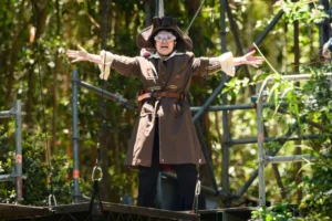 She finally did her first solo Bushtucker Trial on Tuesday night’s episode, dressed as a pirate to walk a wobbly plank 100 feet in the air and collect stars dangling in hard-to-reach places.