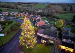 The lit tree stands as the only illumination in the village, which is one of only a few in Britain with no street lighting.