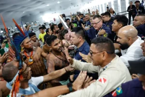 Joao Santiago, a professor at the Federal University of Para, said: ‘The Indigenous movement wanted to present its demands inside the blue zone but were not allowed in.’