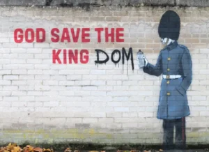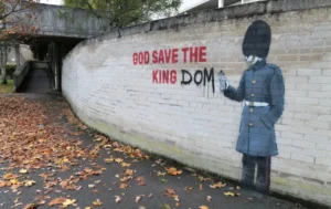 The soldier, standing next to the print message ‘God Save the King’, is holding a can of spray paint.