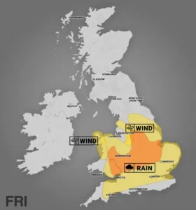 Cheshire and North Yorkshire down to the south coast were given a separate yellow warning for rain for a 24-hour period from 6am on Friday.