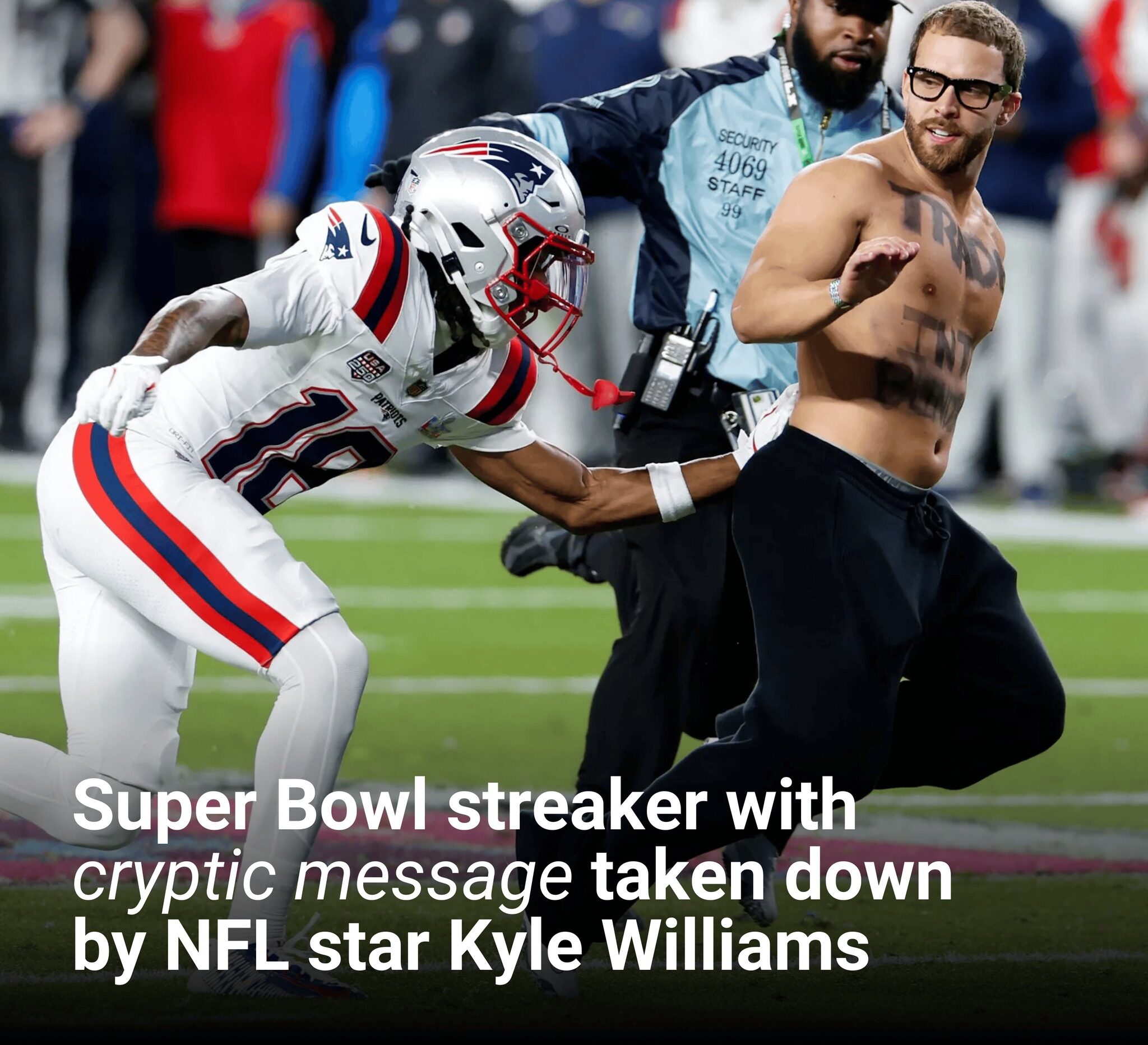 Sunday’s showdown between the New England Patriots and the Seattle Seahawks was interrupted during the fourth quarter when a shirtless streaker sneaked past security and made it to the playing field.