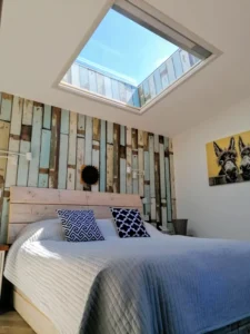 I open the room’s skylight by turning a cog above the bed. I can’t think of anything more peaceful than watching the constellations as I drift off to sleep.